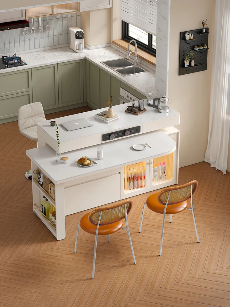 【便利で多機能】スマート岩板茶台・アイランドテーブル一体型ダイニングテーブル - 家庭用伸縮式!電磁調理器と消毒キャビネット付属、キッチン移動式作業台