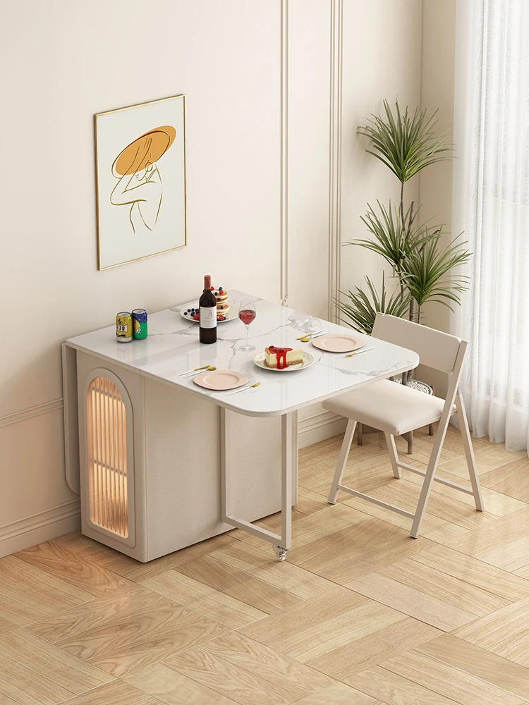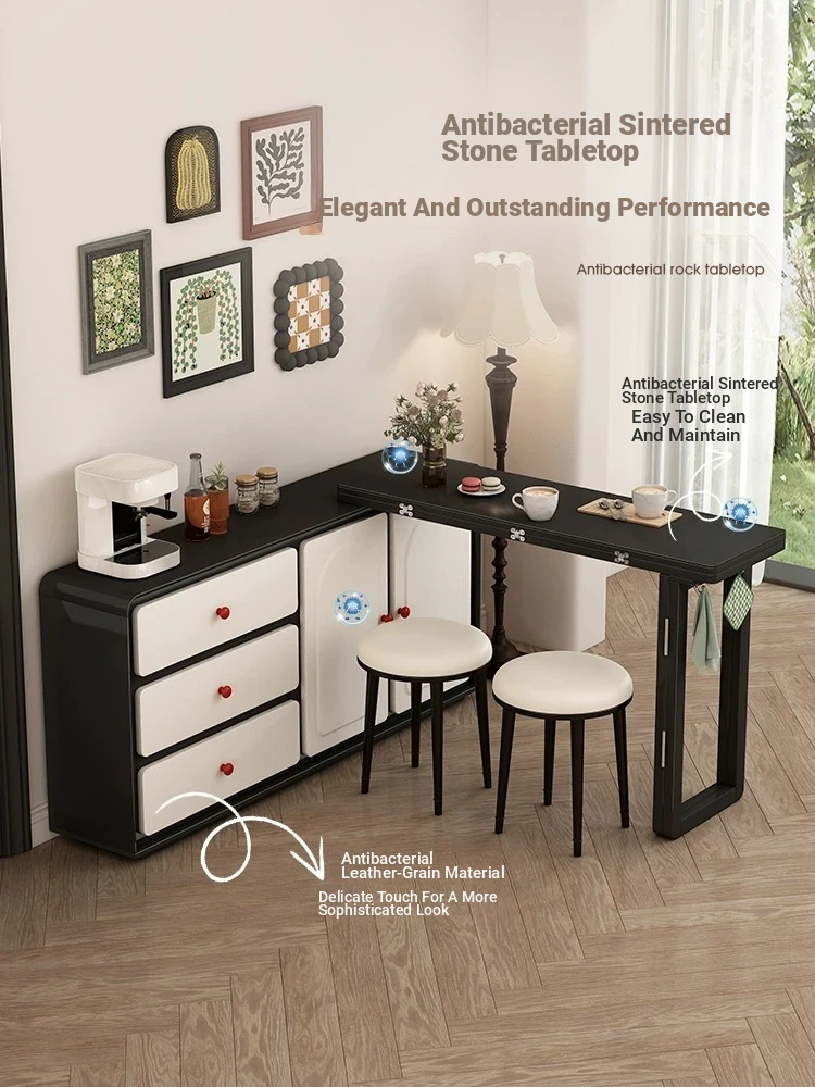 Nordic Minimalist Expandable Stone Dining Table Set with Buffet Cabinet and Water Dispenser - Space-Saving Wall-Mounted Storage Solution for Compact Homes