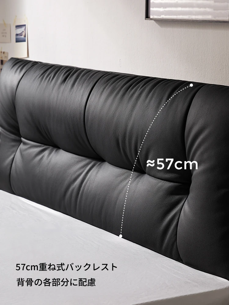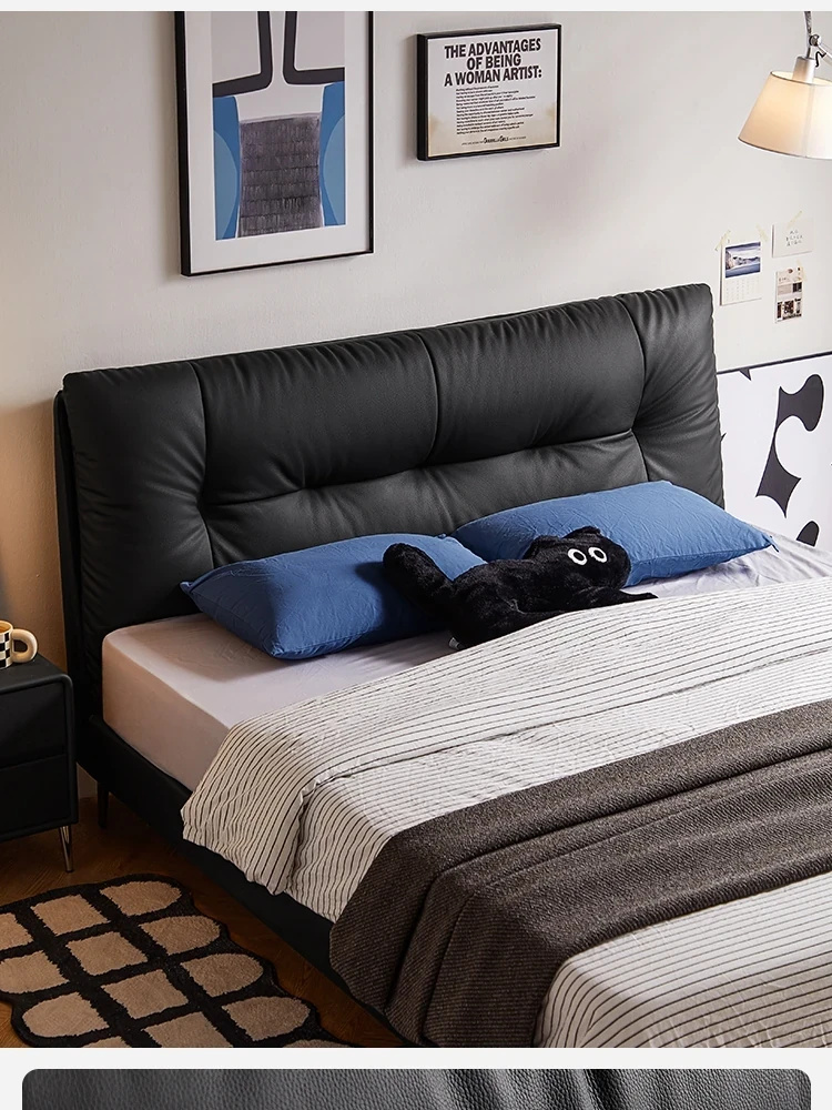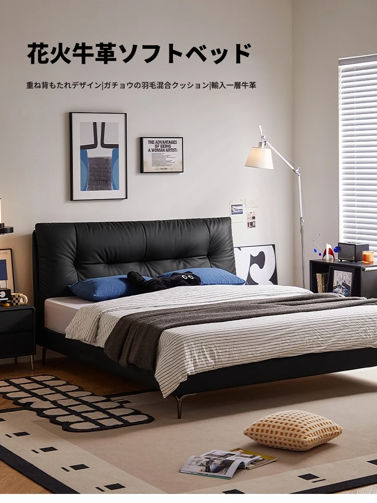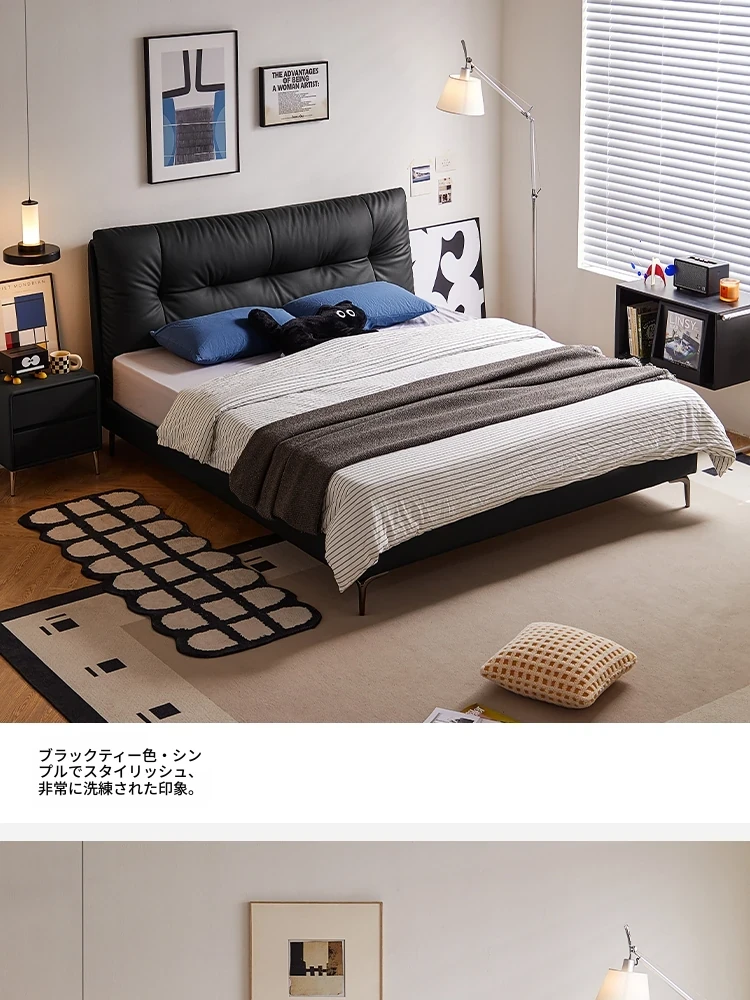 林氏家居 イタリアンミニマリズム ブラック本革ベッド 主寝室用 大型ダブルベッド 高級感あふれるソフトパッケージ家具 木製仕上げ