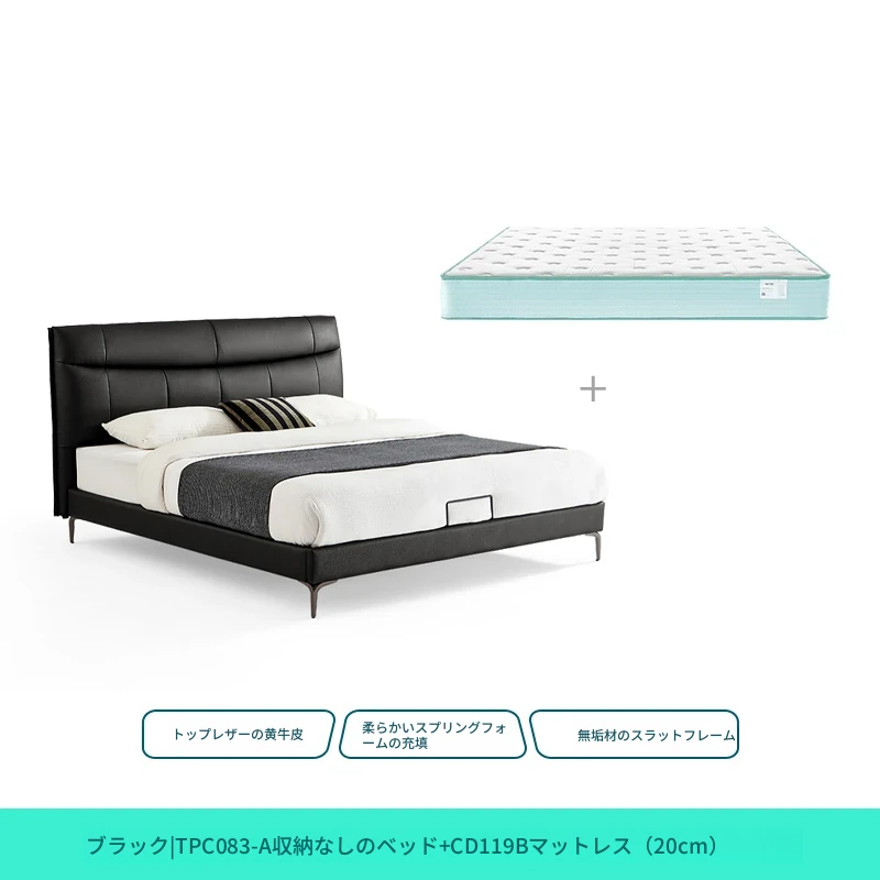(7)【本革|ブラック】シングルベッド+マットレス+ナイトテーブル