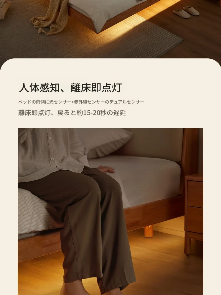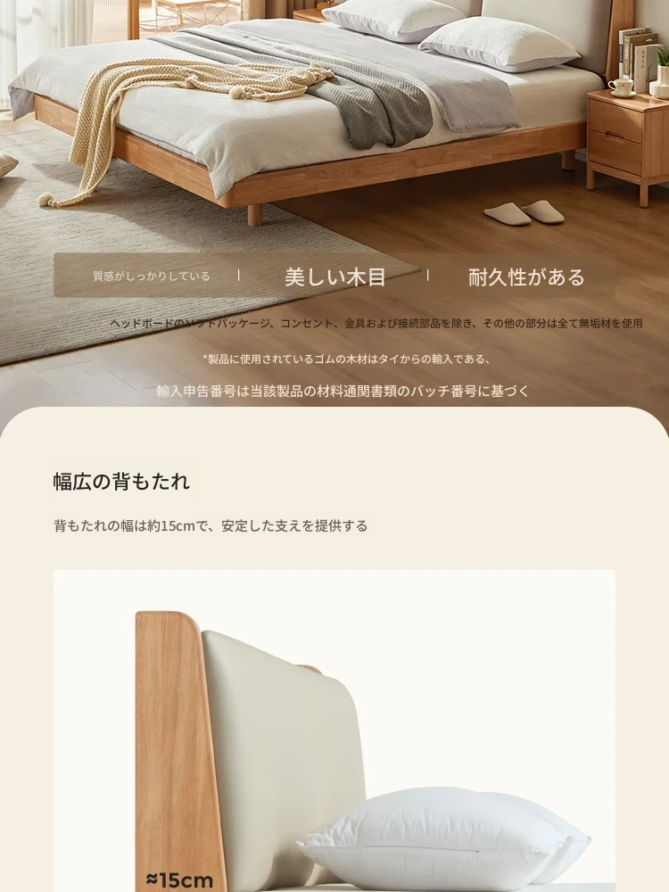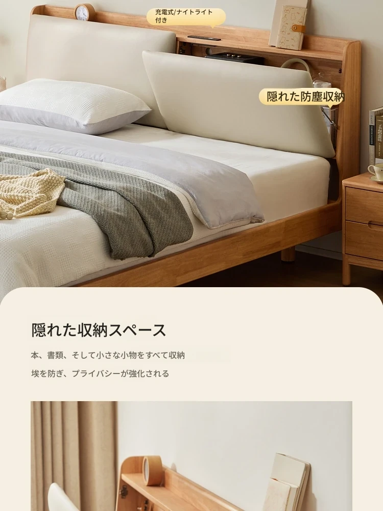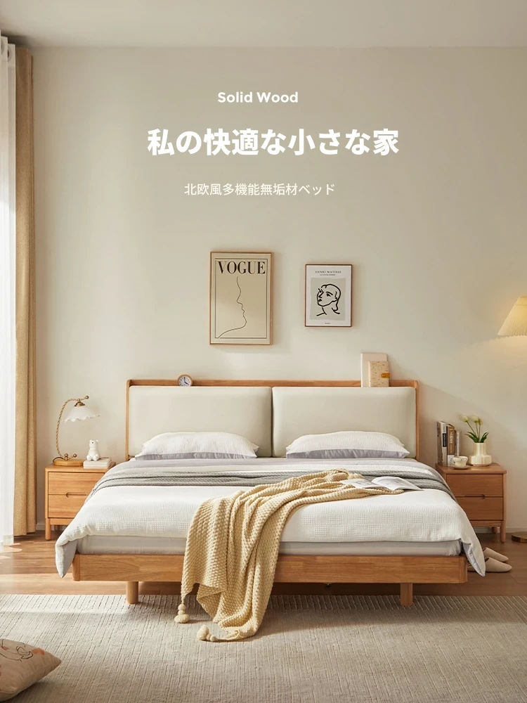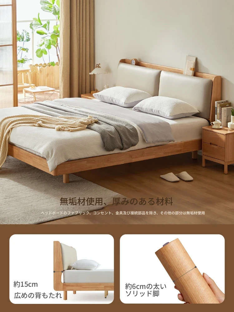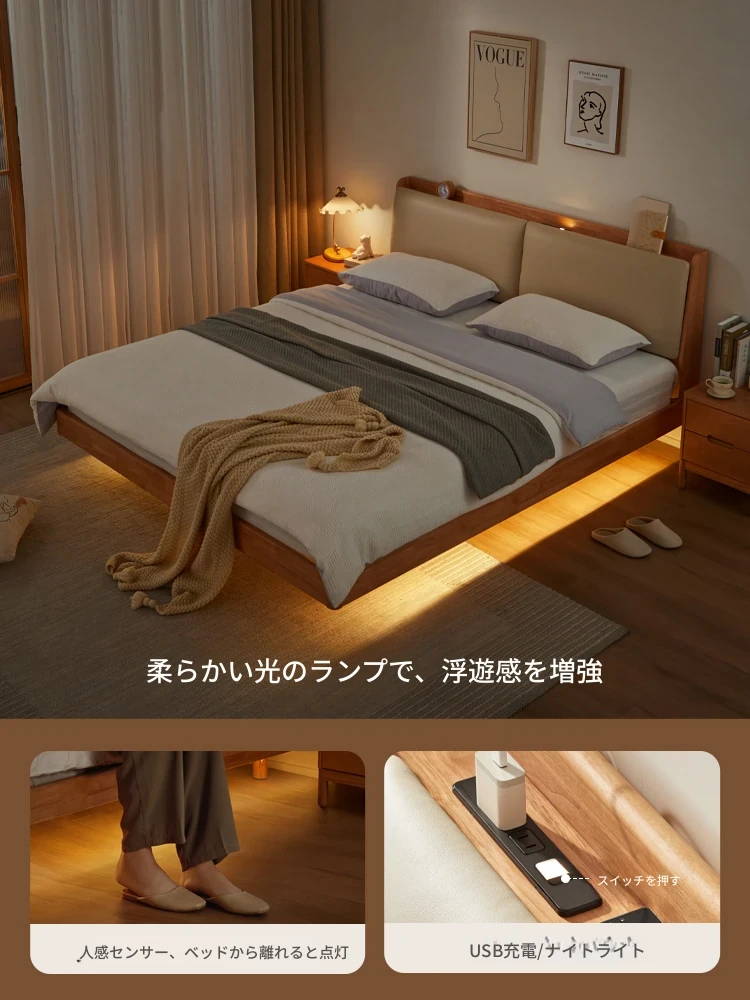 林氏家居 北欧スタイルの天然木製1.5m浮遊式ソフトパッキングダブルベッド - スタイリッシュな収納ヘッドボード付き、快適な眠りをサポートする高品質なデザイン!