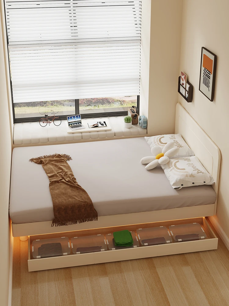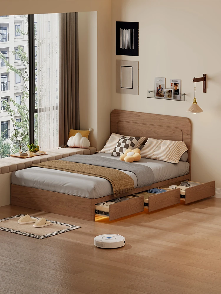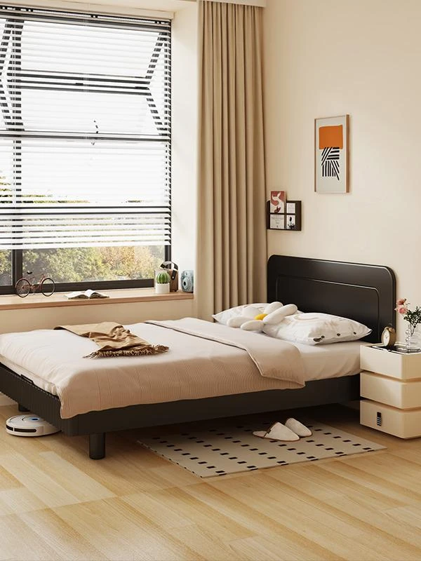 【魅力の極み】ミニマルブラック収納ベッド ─ 静音設計のモダン木製フロアベッド・ヘッドレスタイプ・幅1メートル、セカンドルームにも最適!