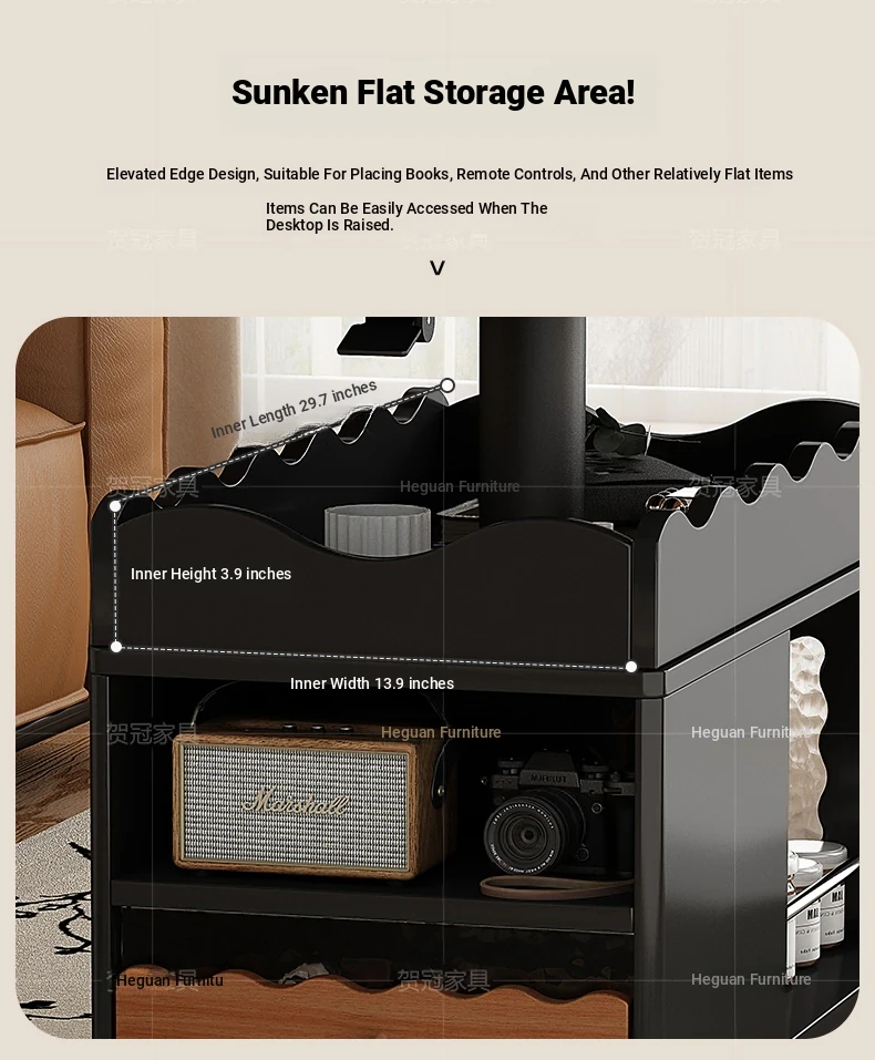 60cm多機能昇降サイドテーブル【ブラック抗菌環境ボード+可昇降回転天板+キャスター+USB充電+LEDライト+指紋ロック】